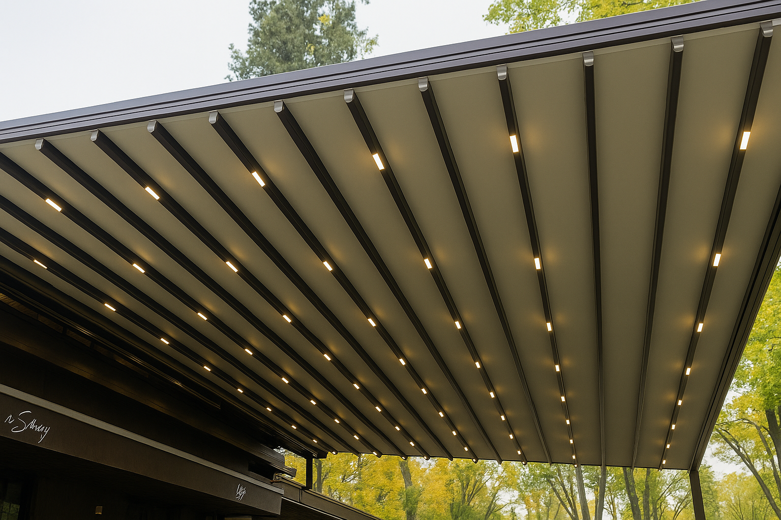Kumaş ve Malzeme: UV dayanımlı, su geçirmez blackout kumaş veya alüminyum lameller kullanılır. İskelet genellikle elektrostatik boyalı alüminyumdur.